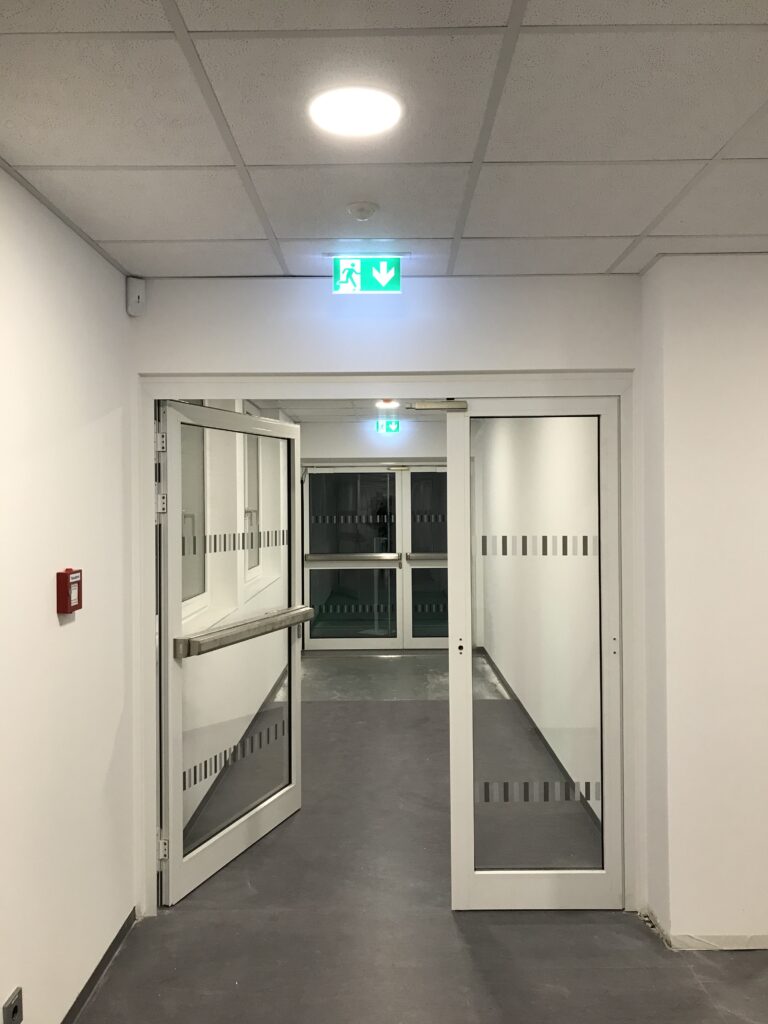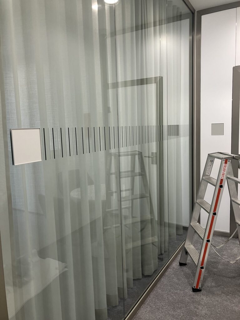 Anlaufschutz oder auch Durchlaufschutz genannt, muss kontrastreich sein. D.h. er muss sich optisch von seinem Umfeld hervorheben. Hier gestalten und produzieren wir Muster (Designs) nach Ihren persönlichen Vorgaben. So stellen wir aus Milchglasfolie oder eingefärbter Plotterfolie maßgefertige „Streifen“ an und montieren diese auf den Glasflächen. Als Standardmaß fertigen wir 120 cm breite Streifen, da diese über 90% aller Türmaße und Glaselemente abdeckt. Jedoch können wir auch alle andere Abmessungen produzieren. Das Material besteht aus: eingefärbtem Ninyl verfügt über einen transparenten Acrylkleber ist ca. 70 µm stark ist abwaschbar und resistent gegen Öle und Fette und hält erfahrungsgemäß 7 bis 9 Jahre im Innenbereich Im Bedarfsfalle bieten wir Ihnen auch Brandschutz zertifizierte Folien nach dem Standard B1 an. Diese Materialien sind schwer entflammbar. Schutz für Mensch und Glas. von dezent bis auffällig alle Größen und Formate individuell gestaltet transparent oder blickdicht