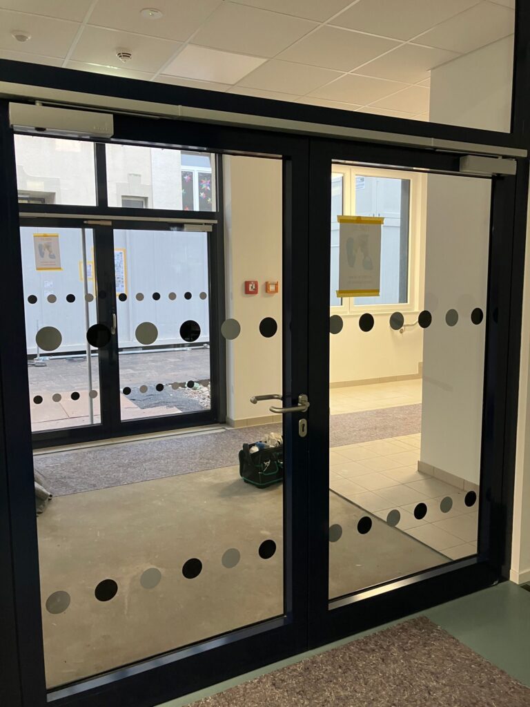 Typische Anwendungen von Durchlaufschutz findet man an: Schulen Kitas Krankenhäusern Sportstätten öffentlicher Veraltung Museen Bushaltestellen und Wartehäusschen Büros Wir greifen hier auf über 30 verschiedene Farben an eingefärbter Folie der Hersteller Oracal, mactac oder Metamark zurück. Alternativ dazu drucken wir mit unseren Maschinen auch jede andere Farbe aus dem CMYK Farbspektrum auf Transparenzfolie. Die Kosten für die Herstellung und Montage eines Durchlaufschutzes beziehen sich auf folgende Leistungen: Grafik / Design Folien Plot oder Foliendruck Entgittern überschüssiger Folie Kaschieren mit Übertragungsmedium (Papier oder Tape) Reinigen und Entfetten der Glasscheibe Ausmessen an der Glasscheibe und Markieren dem Nivelier-Laser waagerechte Montage der Streifen Ablösen der Transferfolie